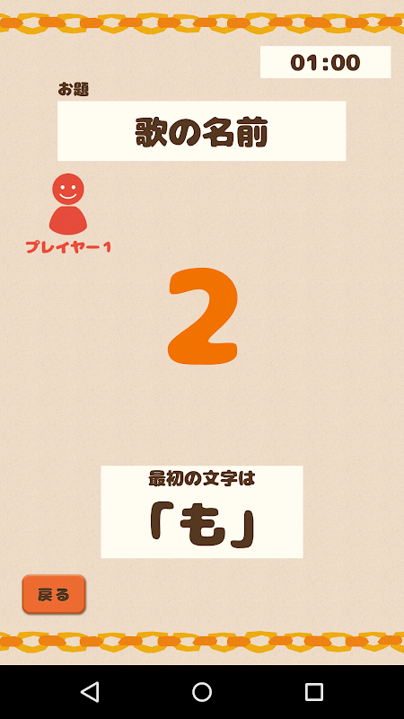 「お題に添わなければいけない」「頭文字をつなげなければいけない」という2つの条件を満たしながら、決められた制限時間内にテンポ良く答えていきます。(これが地味に難しい!)