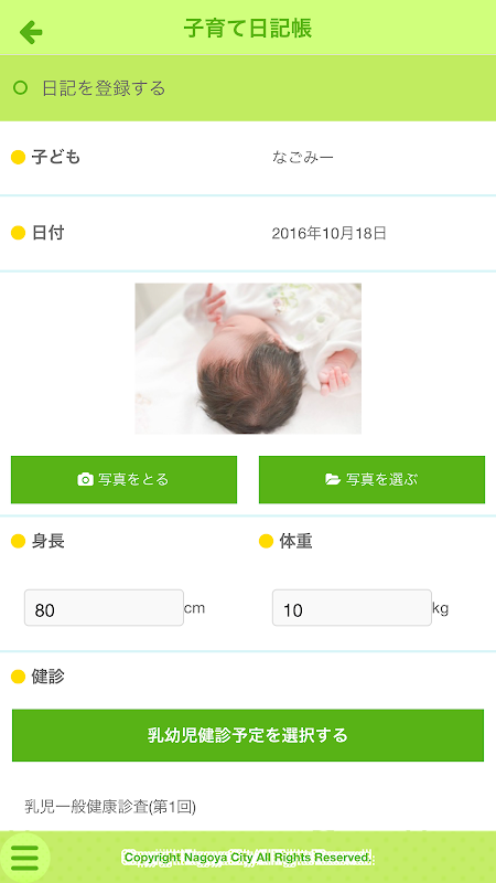 お子様の体重や身長、写真、コメントを登録することで、日々の成長のグラフ管理や日記がスマホで楽しめます。また、日記に健診予定を入れることも可能です。