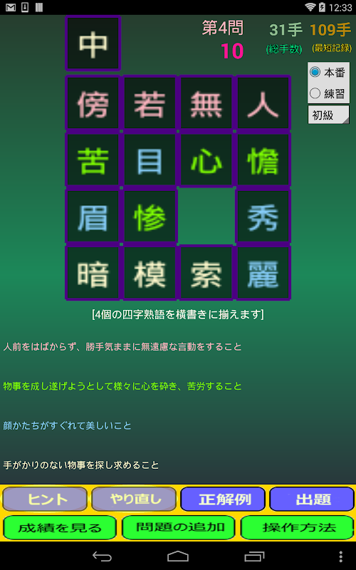 このゲームは、バラバラに並んだ漢字を、15パズルのやり方で4個の四字熟語に並べ替えて、その最短手数を目指すゲームです。