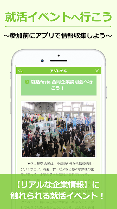 アグレを発行している求人おきなわが提供している「アグレ新卒」は企業や合同説明会の情報を発信する、新卒学生・既卒のための公式アプリです。