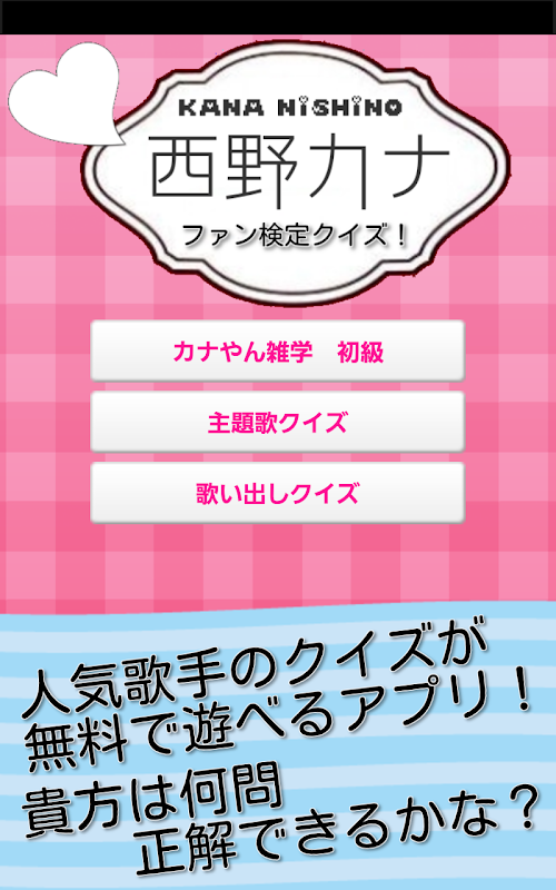 Popular female singer "Nishino Kana"'s fan test (quiz) is a free app.People of Cana yan fans please come and challenge!