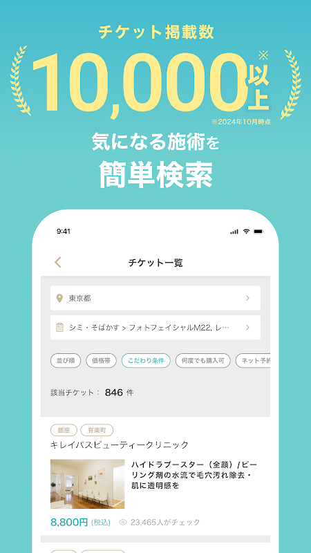 ملک بھر کے بیوٹی کلینکس کے علاج ٹکٹ کی بنیاد پر پوسٹ کیے جاتے ہیں، اور آپ ٹکٹ کی معلومات جیسے کہ ''تفصیلات'' اور ''حصوں'' سے آپ کے لیے مناسب علاج تلاش کر سکتے ہیں۔