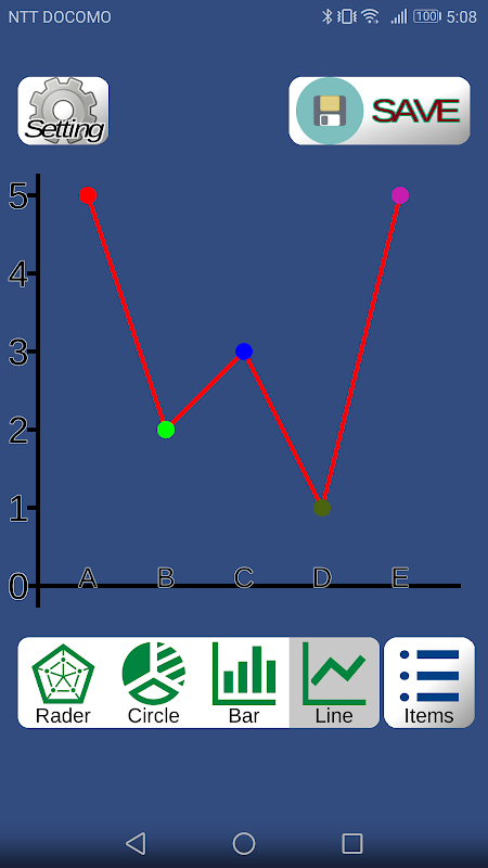簡単操作でレーダーチャート、円グラフ、棒グラフ、折れ線グラフを作れます。 色の変更や表示のオンオフが設定可能で作ったグラフは画像として保存できます。
