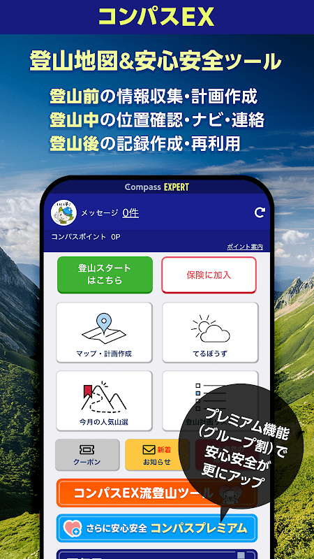 کمپاس EX ایپ کو ملک بھر کے پہاڑی علاقوں میں پہاڑ پر چڑھنے کی اطلاعات جمع کرانے کے لیے استعمال کیا جا سکتا ہے۔ کوہ پیمائی کا منصوبہ بناتے وقت، آپ کوہ پیمائی کے راستے کی تدریجی طاقت، منصوبہ بند راستے کے چلنے کی شدت، موسم کی معلومات، طلوع آفتاب اور غروب آفتاب کے اوقات وغیرہ کو چیک کر سکتے ہیں۔ چڑھائی کے دوران، یہاں تک کہ اگر آپ مواصلات کی حد سے باہر ہیں، آپ پہلے سے ڈاؤن لوڈ کیے گئے کوہ پیمائی کے نقشے اور ایک GPS سیٹلائٹ کا استعمال کرتے ہوئے اپنا موجودہ مقام چیک کر سکتے ہیں، اور آپ ہنگامی طور پر پیدل سفر کے دوران اپنی جگہ کا اشتراک کر سکتے ہیں۔ رابطے پہلے سے رجسٹرڈ ہیں۔