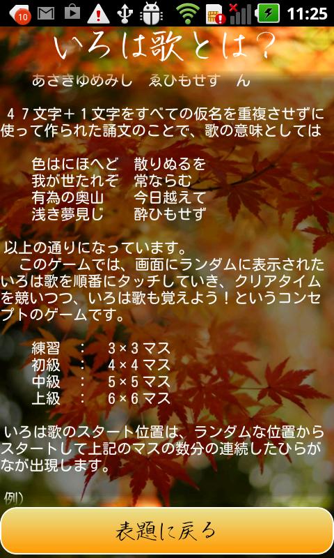 画面にランダムに表示されたいろは歌を順番にタッチしていき、クリアタイムを競いながら「いろは歌」も覚えよう!