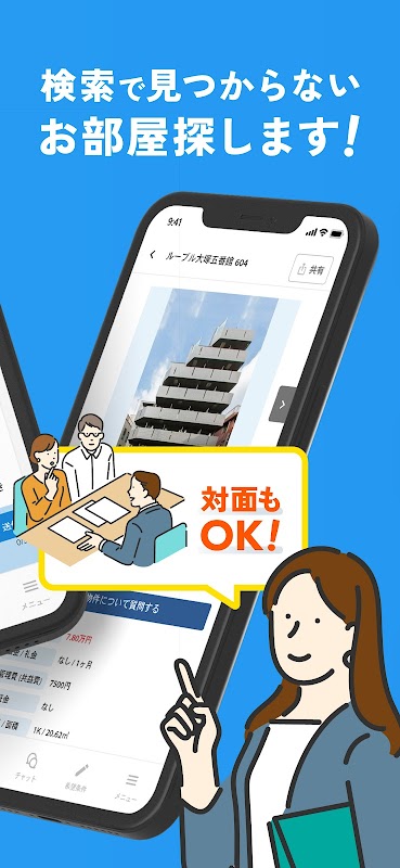 ایک رئیل اسٹیٹ ایجنٹ جسے اسٹور پر آنے کی ضرورت نہیں ہے۔ ایک ایسی ایپ جو آپ کو کرایے کی جائیدادیں تلاش کرنے کی اجازت دیتی ہے جو تلاش میں نہیں ملتی ہیں۔ ٹوکیو اور اوساکا میں کمرے تلاش کریں، اکیلے رہنے والے اسٹوڈیوز، نئے بنائے گئے کرائے کے اپارٹمنٹس، پالتو جانور، اور رہائش کے لیے پراپرٹیز۔