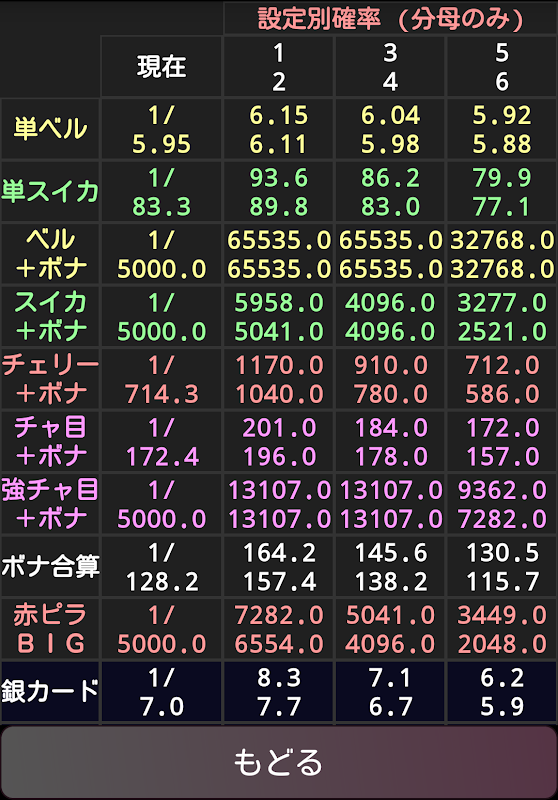 ⑧現在の出現率と各設定の出現率を一覧表示可能