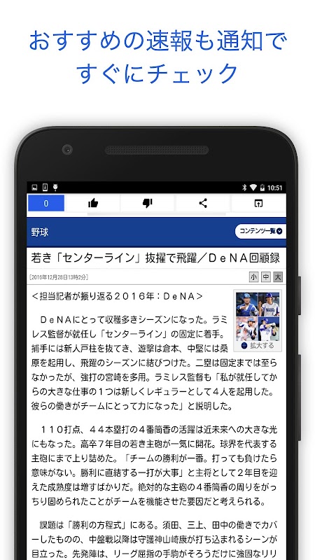 - 「ニュース」ではベイスターズの最新ニュースが得られます。