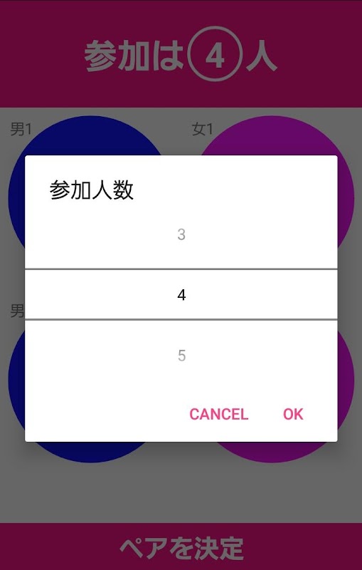 合コンや肝試しなどペアをつくるときに便利です。 操作は簡単で人数を設定して「ペアを決定」ボタンをタップするだけです。 アルファベットが同じ男女がペアになります。
