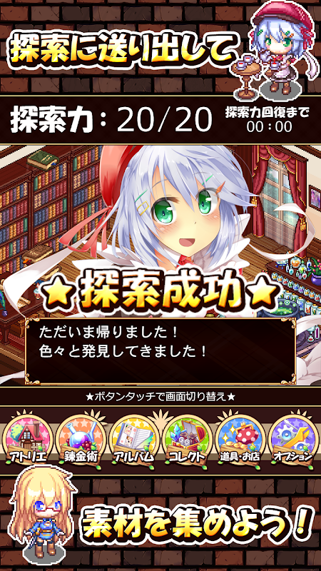 お料理好きの少女「ホム」&王国錬金術師「アリサ」と探索&錬金するどたばたRPG! 探索で素材を収集⇒錬金してコレクションを増やせばシナリオが開放されます。