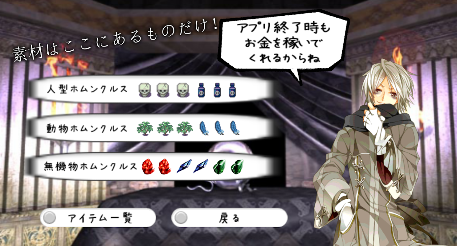 ホムンクルスは自動的にお金を稼いできてくれるから、プレイヤーは放置して眺めるだけでもOK!!!
