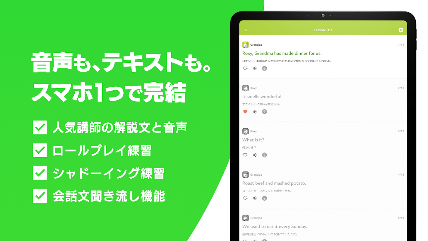 گفتگو کے مناظر کو دوبارہ چلانے کے علاوہ، آپ آسانی سے خود سے انگریزی گفتگو کی مشق کر سکتے ہیں، جیسے رول پلے پریکٹس اور شیڈونگ پریکٹس۔