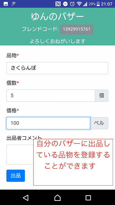 バザー画面のフレンドコードをタップするとクリップボードにコピーしてゲーム内で貼り付けができます