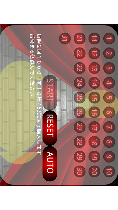 ミニロトの架空抽選シミュレーションです。あなたの選択した5つの数字は何回大当たりを射止めるか?週2回1000円を10年間続けた時の結果をシミュレーションします。