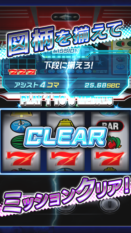 毎ゲーム出題されるミッションに従い、制限時間内にパチスロのリール図柄を止める「パチスロ目押しゲーム」