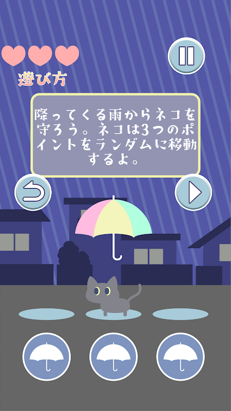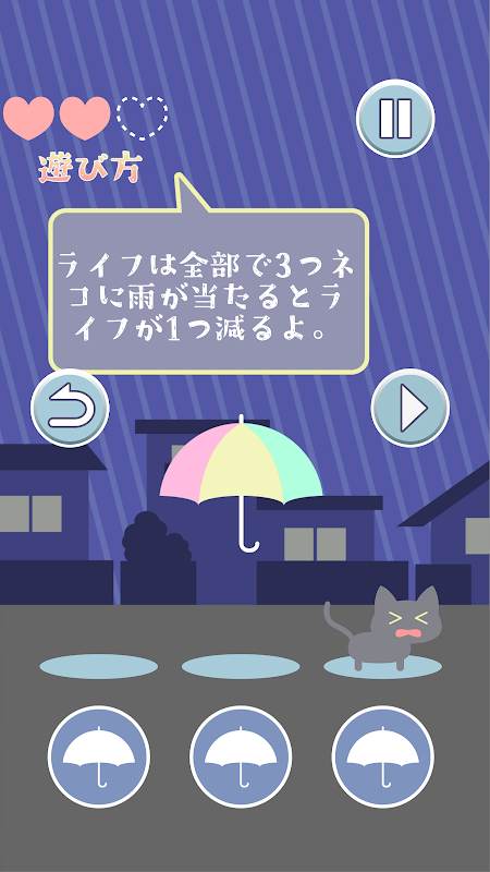 اسکرین پر ایک پوائنٹ کو تھپتھپانے سے ایک چھتری نمودار ہوتی ہے اور بلی کو بارش سے بچاتی ہے۔