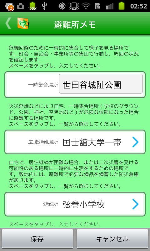 ・一時集合所、広域避難場所、避難所、家族の集合場所の登録・閲覧