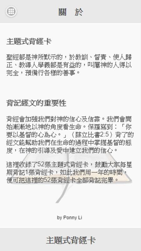 這裡收錄了52張主題式背經卡,鼓勵大家每星期背記1張,如此用一年的時間,我們便可把這裡的52張背經卡全部背記完畢,方便應用於日常生活中。祝福大家經常地吸收神的話語!