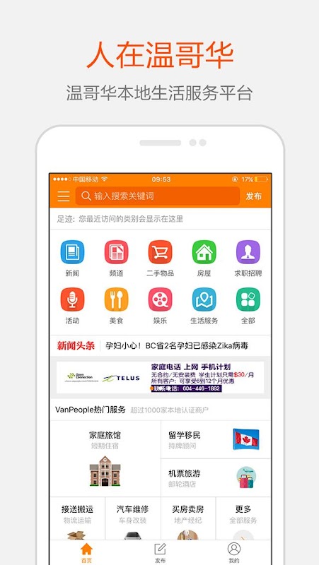 温哥华本地生活信息浏览/发布平台,每天有上百条信息供您选择。"人在温哥华"APP是一款面向加拿大,温哥华华人的生活信息应用平台,旨在为新老移民,留学生提供自由交流的信息平台。