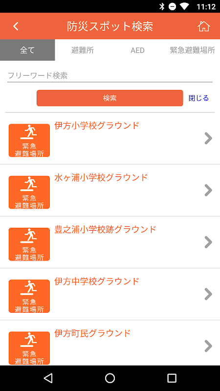 避難スポットを避難所・AED・緊急避難場所のカテゴリ別に分けてリスト画面とマップ画面で表示します。