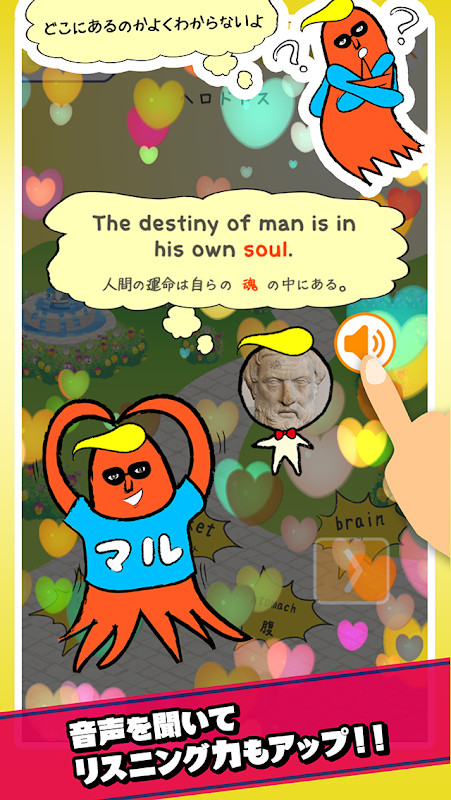 このアプリでは「タコダさん」の疑問や質問に対し、偉人たちが名言をアドバイスするという形式をとります。英語と日本語のやりとりで前に進み、隠されている名言のキーとなる英単語を4択の答えの中から選んでいきます。