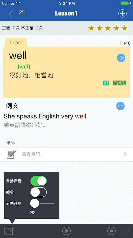 ・錄音功能可以讓您在學習的時候錄下自己的聲音進行照,同時也可以使用備注功能寫下自己對單詞一理解或注釋。