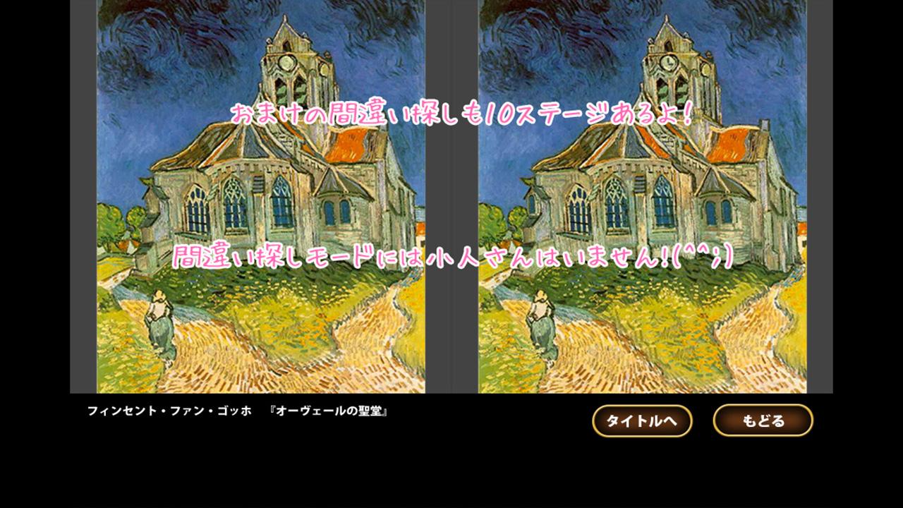 タップすると名画が動く?! 10枚の名画の中に隠れた100人の小人を探そう! 100人見つけると間違い探しモードで遊べるようになるよ。