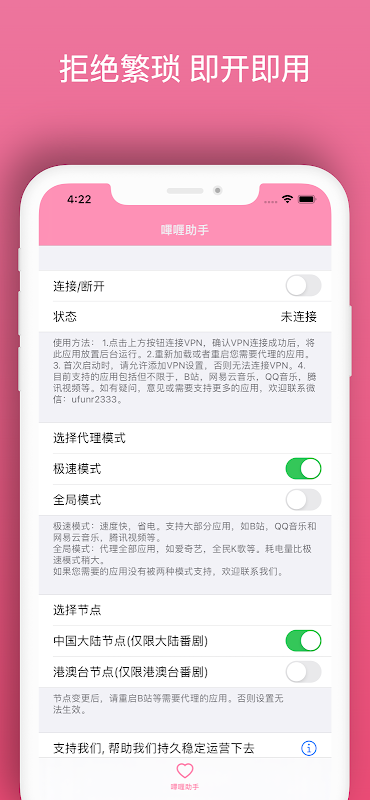 - 不会影响非国内APP的功能,可保持全天24小时开启.