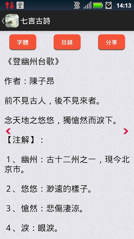 1 分類詳細,本APP包含以下分類:七言古詩、七言絕句、七言律詩、七言樂府、五言古詩、五言絕句、五言律詩、五言樂府、宋詞(一)、宋詞(二)、名句和元曲;