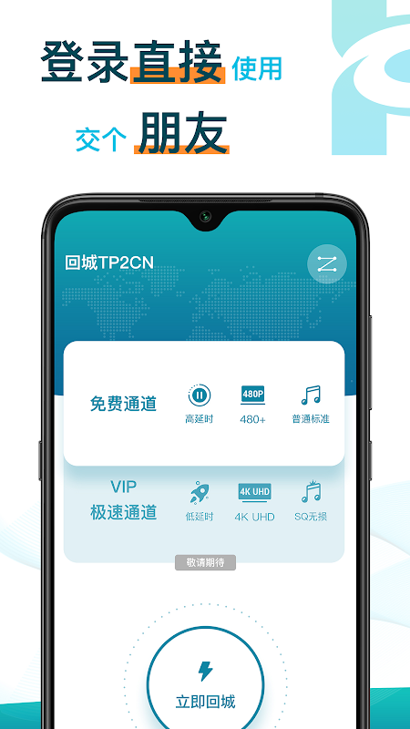回城TP2CN是海外华人必备的加速器,快速开启爱奇艺、B站、腾讯视频、优酷、YY语音、网易云音乐等国内音视频和网站,帮助你解决海外播放时的卡顿问题,随时随地享受服务。