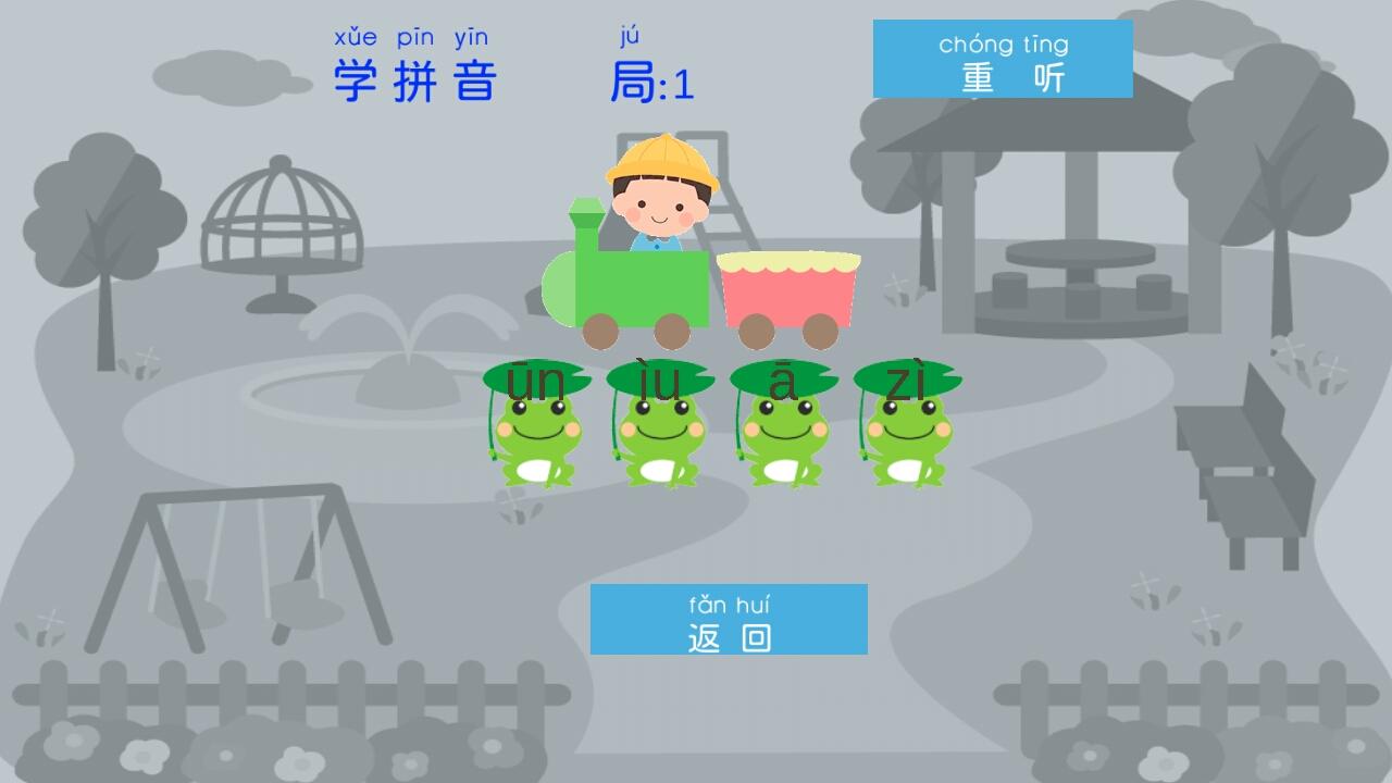这是一个学拼音,玩拼音,认拼音,记拼音,练拼音,考拼音的游戏。分基础和进阶2个等级,各有56局。适用于正在学习拼音的小朋友,可以用来检测/记忆拼音学习效果。结合小朋友的学习特点,主要还是以自愿为主,以玩的开心为原则,寓教于乐。