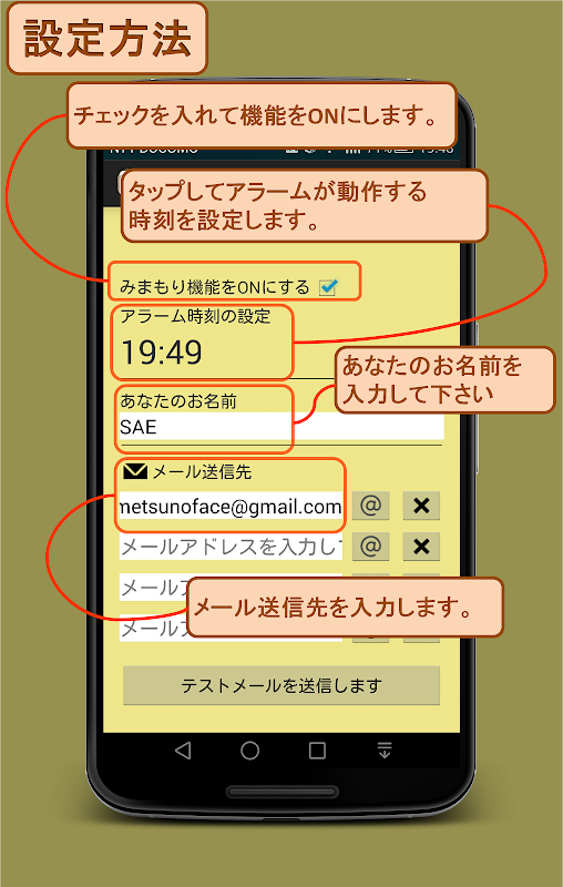 大切なご家族の安全を見守るためのツールで無料でご利用いただけます。一日一回、指定時間にスマホのアラームがなり、応答すると指定宛先にメールを送信します。