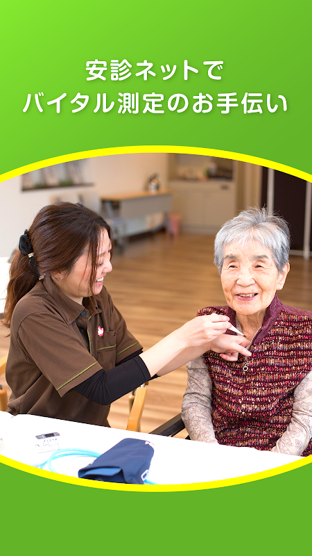 安診ネットカイゴは、介護における日々のバイタル情報(体温、血圧、脈拍、SpO2、呼吸数、血糖値、体重)を管理し、バイタル異常値を検知してお知らせします。