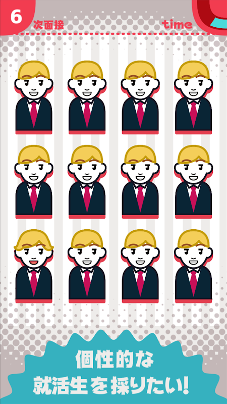 あなたは採用担当!! 弊社では「個性的な」人材を欲している たくさんの就活生に隠れている 個性的な人材を見つけてGETしよう! 会社の社運は君に掛かっている!