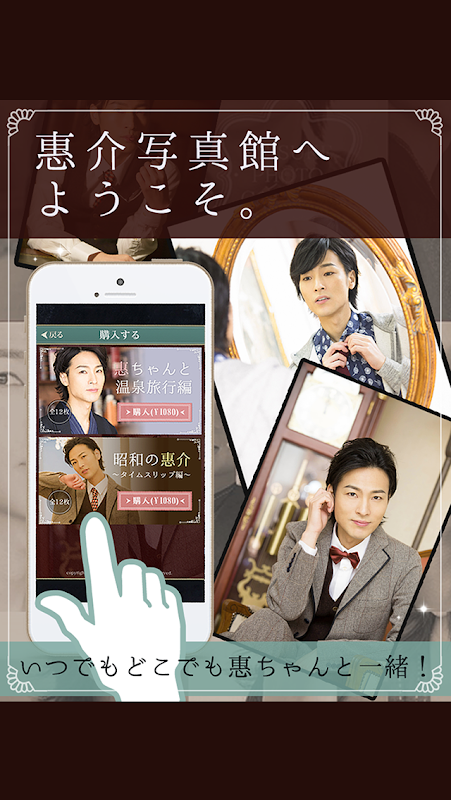 『惠介写真館』はその名の通り、モダンな写真館をコンセプトにした、レトロな趣きを感じる写真集アプリで、『惠ちゃんと温泉旅行編』、『昭和の惠介~タイムスリップ編~』と、2つのギャラリーが置かれ、それぞれ12枚の撮りおろし写真を眺めて楽しむことが出来る。