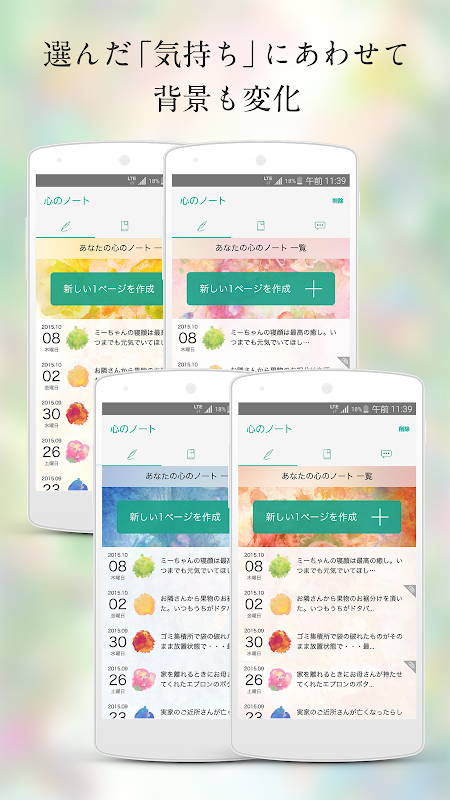 日々、あなたが感じる“気持ち”を手軽に記録できる日記。それが心のノートです。 さまざまな“気持ち”を日記に綴り、心を整理し、心の環境を整えましょう。
