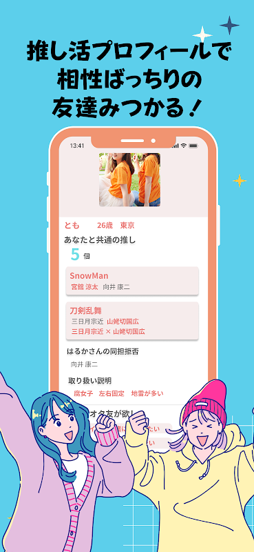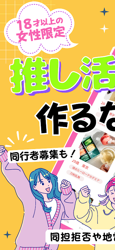 اپنے پسندیدہ بتوں اور اوٹاکو سرگرمیوں کے لیے دوست بنائیں! آپ کے پسندیدہ بتوں، خواتین کے دوستوں، اور اوٹاکو دوستوں کو تلاش کرنے کے لیے صرف خواتین کے لیے ایپ جو آپ کی اقدار کا اشتراک کرتے ہیں! ساتھی، مہمات، اور سامان کے تبادلے کے لیے بھی دستیاب ہے۔ 18 سال یا اس سے زیادہ، مفت رجسٹریشن، اور قابل اعتماد تعاون