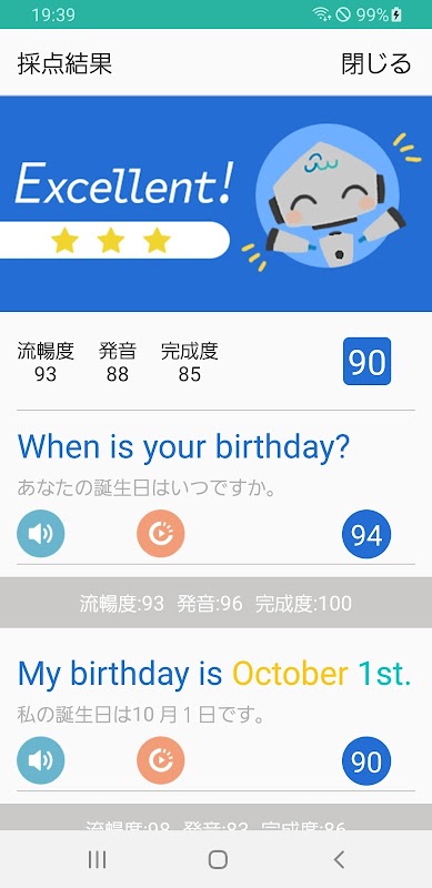 ●「かいわ」では「流暢度」「発音」「完成度」の3つの点数も出ます。