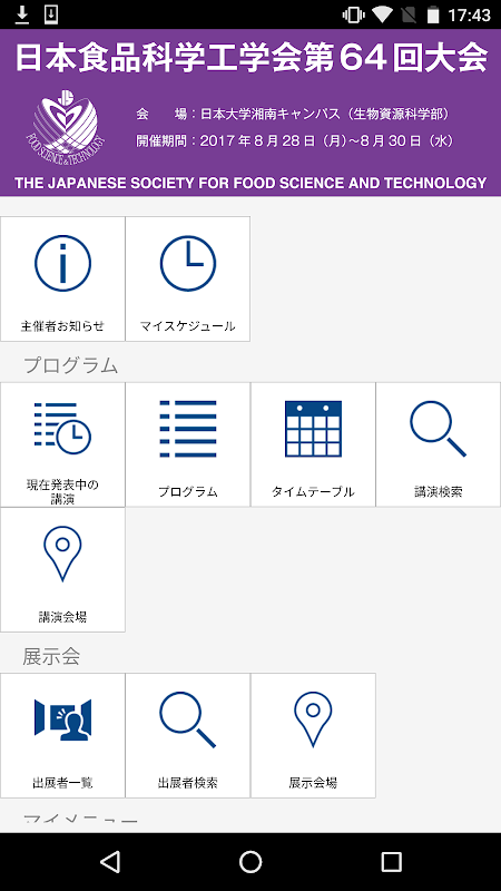 本アプリは「日本食品科学工学会 第64回大会」の電子プログラムアプリです。