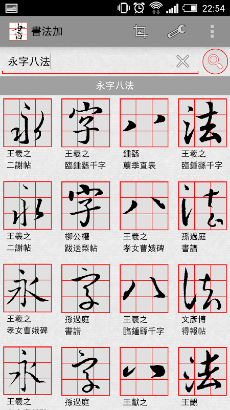 1. 查詢單字:列出單字在各書法家在各字帖中的寫法。