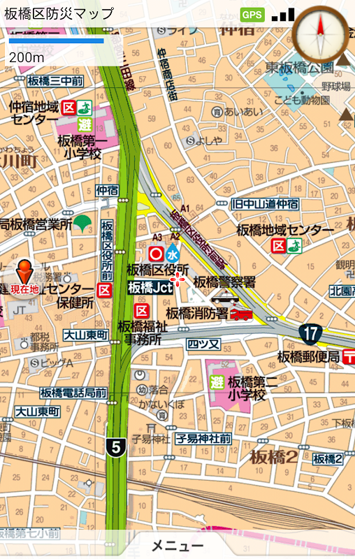 「板橋区防災マップ」は端末に保存されますので、インターネット通信環境のない状況でも地図を閲覧できるほか、端末のGPS機能を利用して現在地を地図上に表示させること(現在地表示)、現在地周辺の避難所や避難場所等の情報を検索すること(周辺検索機能)、あらかじめ目的地を登録しておくことで、現在地と目的地を結ぶ直線(ガイドライン)や目的地の方向を表示することが可能です。