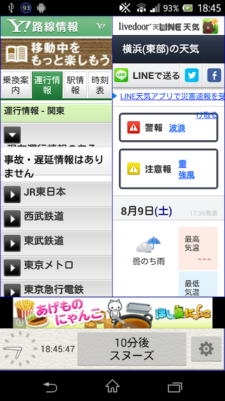 その場合でも時間通りにアラームが鳴った後、天気予報と電車の運行状況をそれぞれ表示されるので、それだけでも便利かと思います。
