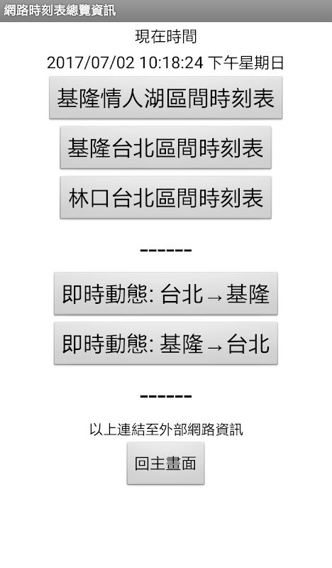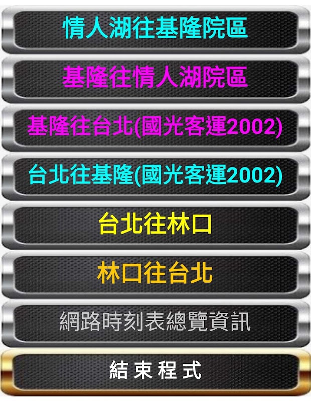 基隆--台北、基隆--情人湖、台北--林口 區間汎航時刻表,以及下一班車時刻顯示。