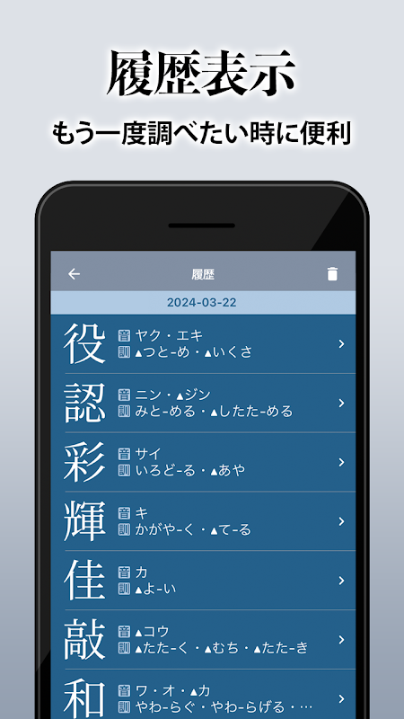 ایک ناقابل یقین حد تک استعمال میں آسان کانجی لغت ایپ۔ ہاتھ سے لکھی ہوئی تلاش کے علاوہ، آپ تلفظ اور ریڈیکلز کے ذریعے بھی تلاش کر سکتے ہیں۔ یہ ایک تجویز کردہ، مستند کانجی لغت ایپ ہے جو 10,000 کانجی کو سپورٹ کرتی ہے!