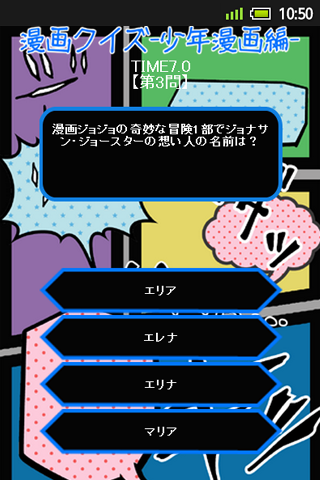出題されるクイズは主に黄金期と呼ばれている時代の人気少年マンガが中心です。