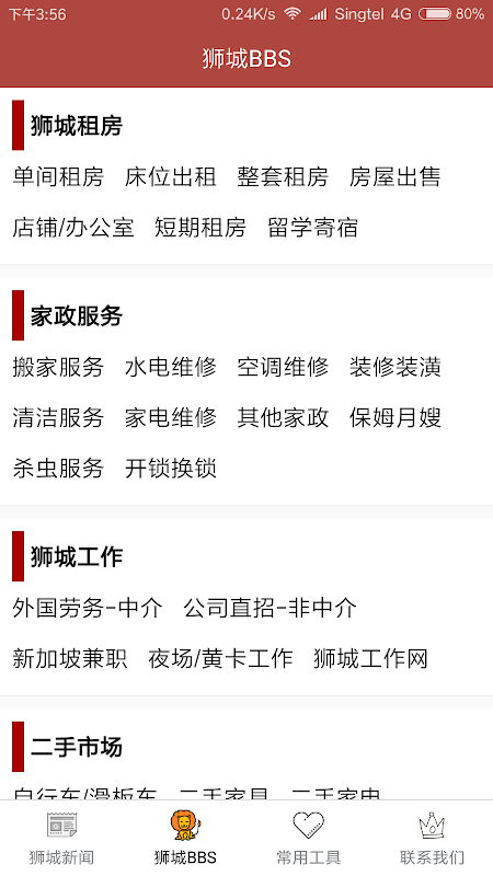 第二,狮城BBS,免费发布和浏览新加坡免费的广告。新加坡租房和买房,新加坡二手买卖,新加坡家政服务,新加坡工作,空调清理,搬家服务,新加坡交友,家教补习等。