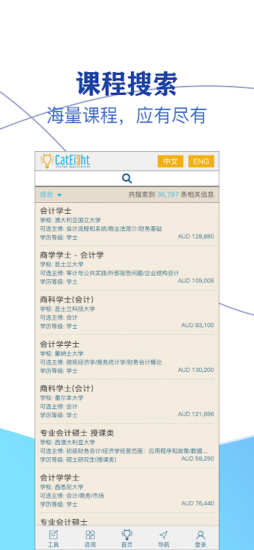 Maoba.com نے یونیورسٹیوں، مڈل اسکولوں، پرائمری اسکولوں اور لینگویج اسکولوں کا احاطہ کرتے ہوئے دسیوں ہزار کورس کا ڈیٹا اکٹھا کیا ہے۔ یہ اصل "توسیع کرنے کے لیے فہرست پر کلک کریں" پریزنٹیشن موڈ کو اپناتا ہے، جس سے طلباء اور تعلیمی ثالثوں کو بدیہی طور پر تفصیلی تعارف دیکھنے کی اجازت ملتی ہے۔ ہر کورس بشمول الحاق شدہ ادارے، کیمپس، شعبہ جات، ٹیوشن فیس، کورس کی آفیشل ویب سائٹ کے لنکس، آغاز کا مہینہ، داخلے کے تقاضے، انگریزی کے تقاضے، وغیرہ، اور کورس کا موازنہ فراہم کرتے ہیں تاکہ ان کو فوری طور پر سب سے موزوں اور لاگت سے موثر میجرز کو فلٹر کرنے میں مدد مل سکے۔ کورسز.