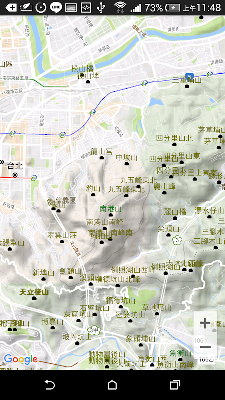 1. 可選擇及呈現台灣大小山,包括一等二等三等及其他三角點共4千多筆資訊標誌於地圖上,並用不同顏色區別,點觸標誌可顯示山名及山高。一等:紅色,二等:紫色,三等:綠色,其他:黃色