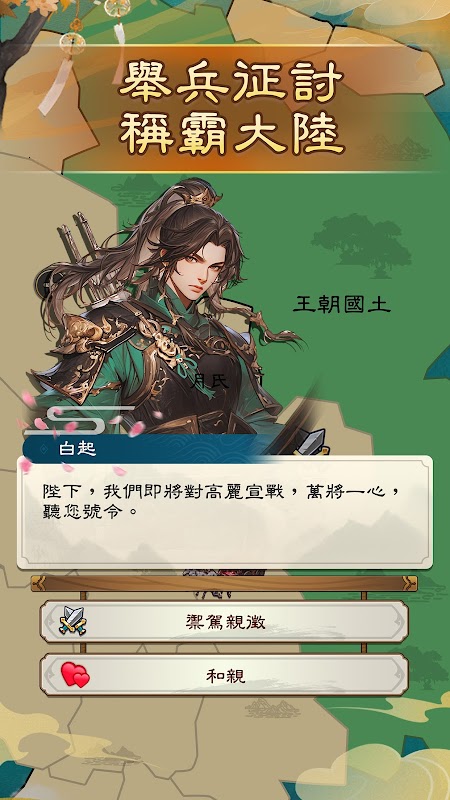 ایک عظیم الشان دنیا کا نقشہ: ایک وسیع علاقے کو دریافت کریں اور فتح کریں۔ اپنی فتح کا سفر شروع کریں، مختلف ممالک سے نایاب اشیاء اکٹھی کریں، دولت کمائیں، اور ان وسائل کو اپنی قومی طاقت کو بڑھانے کے لیے استعمال کریں۔ جنگ کی آگ کو کبھی بھی اپنی سرزمین کو جلانے نہ دیں اور طاقتور دشمنوں کے حملے کا مقابلہ کرنے کے لیے مشہور تاریخی جرنیلوں کو بھرتی کریں۔