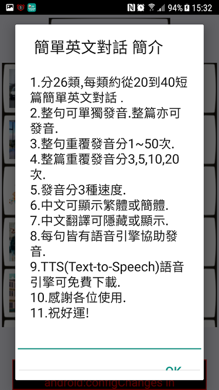 分26類,每類約從20到40短篇簡單英文對話. 整句整篇皆可發音. 整句重覆發音分1~50次. 整篇重覆發音分3,5,10,20次. 語音引擎發音.